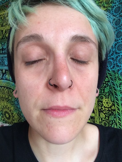 Most of the redness is where I caught the sun. It was super hot and sunny most of the weekend so my skin did a lot of drying out! I did roll around on Sunday without applying any lotion so it’s my own fault that I’m a bit red on the nose (and the knees!). It’s been two days since I came back and my skin has been really itchy the last few days which hasn’t been fun. =[